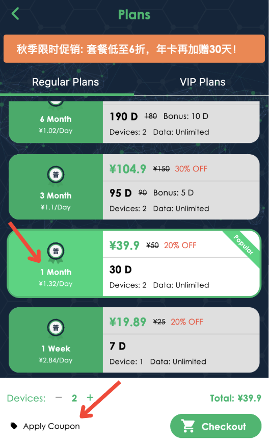 At the bottom of the screen, tap “Apply Coupon”, enter your coupon code, and confirm to enjoy your discount.